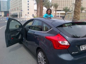 NJD enjoys the sun roof while waiting in the Focus - it was the first car in the line-up at DWTC as we wait to kick-start the Dubai Peace Drive