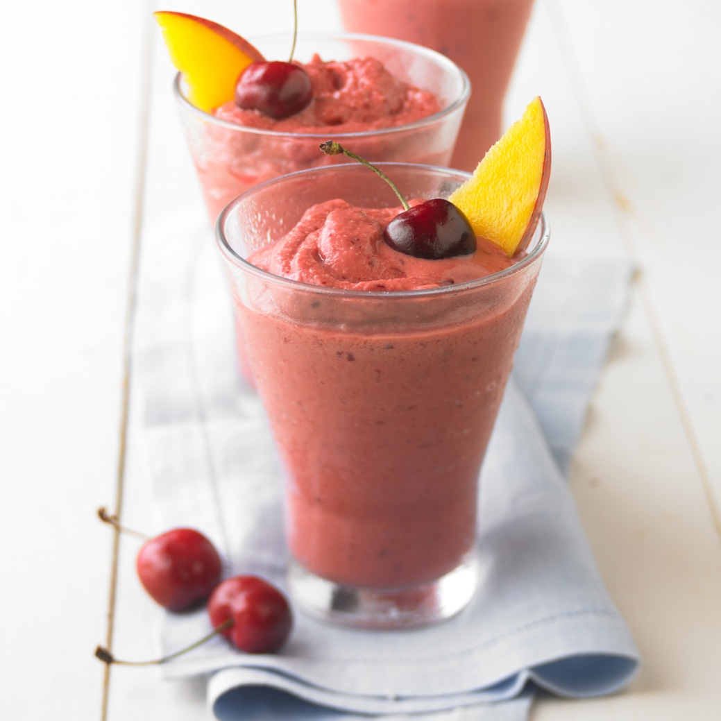Pour into glasses and garnish with a fresh cherry and/or mango slice as desired. Refrigerate or freeze any leftover smoothie mixture.