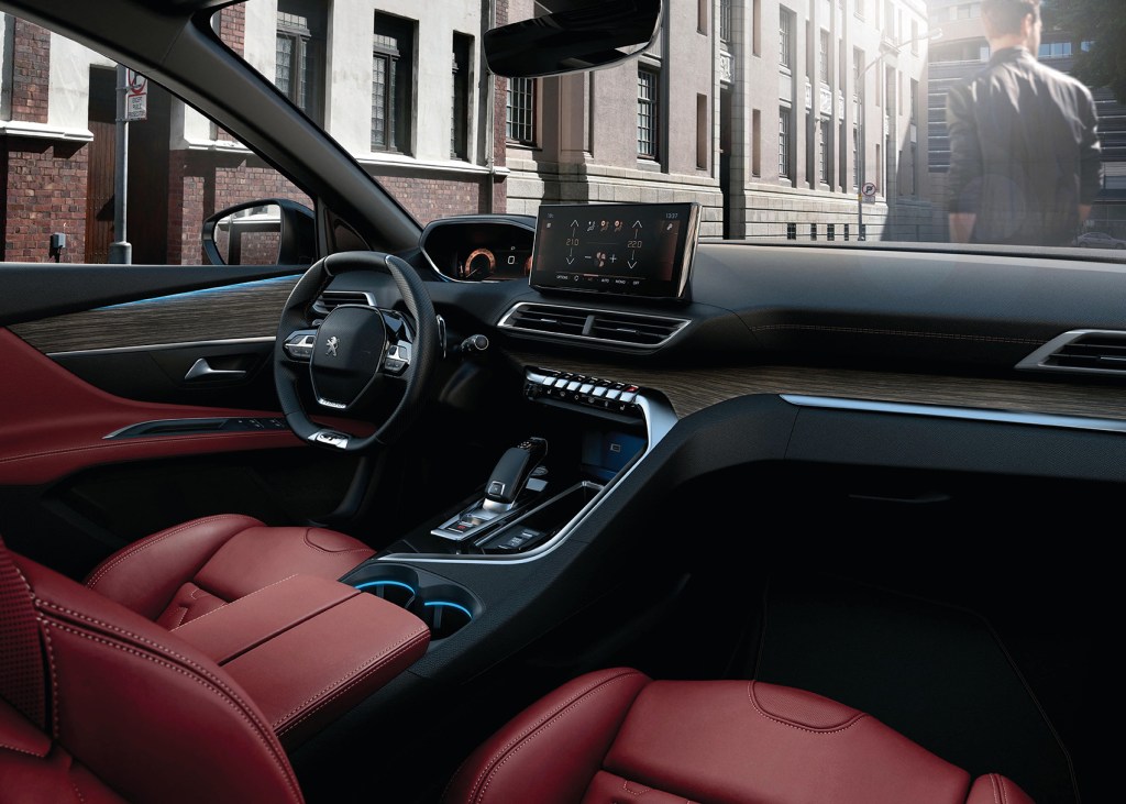The central touchscreen is perfectly positioned and accompanied by seven ‘piano key’ toggle switches which operate the main i-Cockpit® features: radio, air conditioning, navigation, vehicle settings, telephone, phone mirroring, ambient-lighting in addition to multi-point seat-massage.