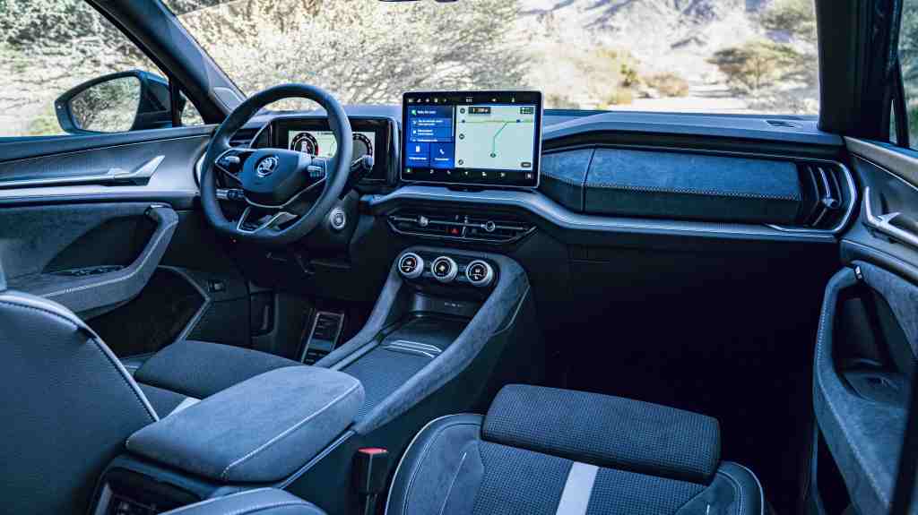 Inside, the Kodiaq doesn’t skimp on luxury or comfort. The base Selection trim includes plush fabric seats, while the Sportline offers an upgrade to leather and Alcantara sport seats, alongside a panoramic sunroof that brightens the cabin. Premium ambient lighting sets the mood, creating an inviting environment for every journey.