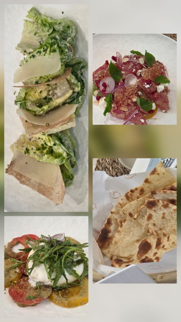 We began our lunch meal with a Watermelon Feta Salad, a perfect harmony of sweet and savory with sous-vide marinated watermelon, Greek feta, raspberry caviar, and a delicate garum dressing that elevated every bite. The Garum Caesar Salad was equally delightful, with crisp baby gem lettuce, aged parmigiano, and beef bacon, all kissed by that signature garum flavor.